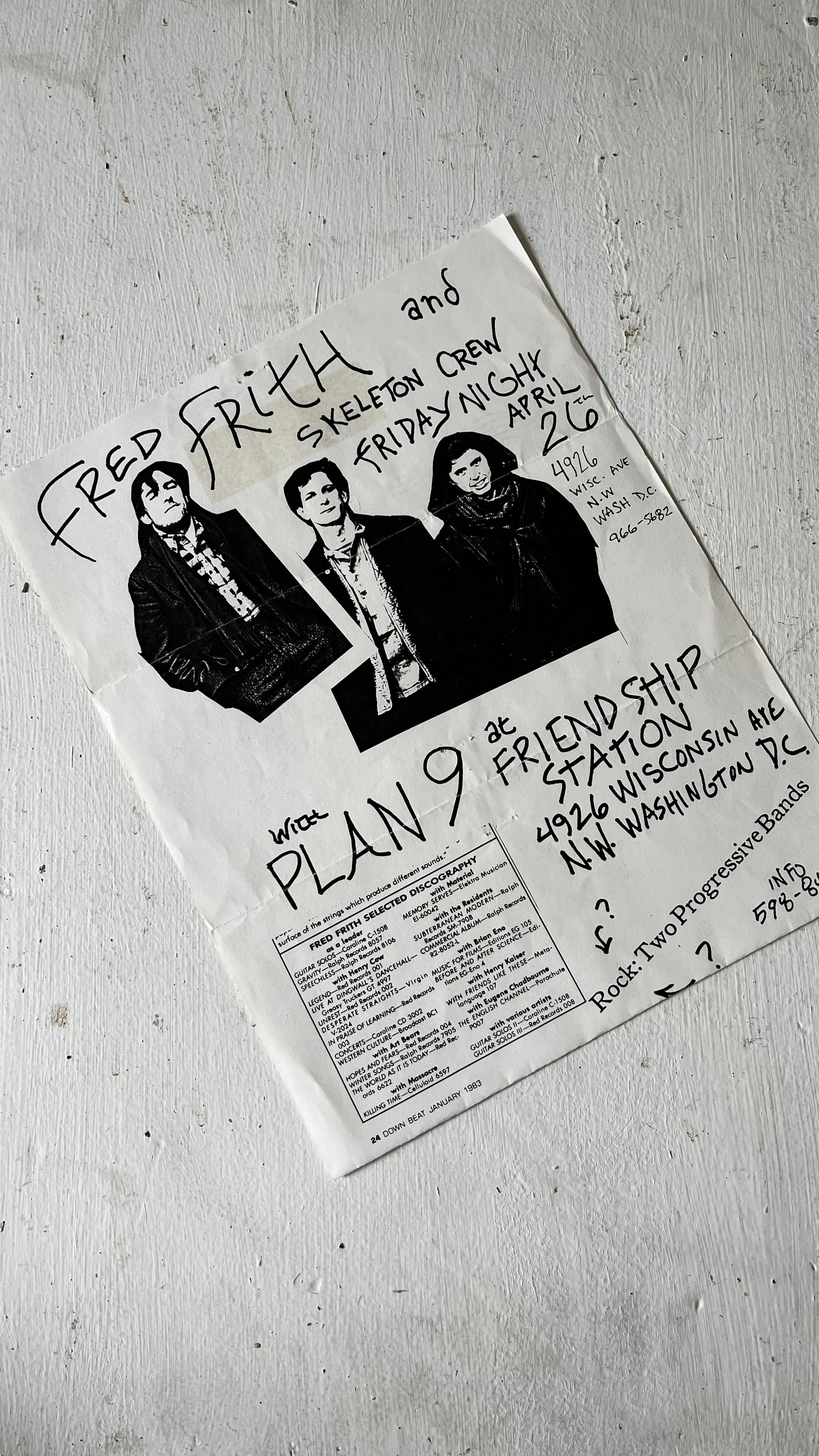Xeroxed flyer for a DC area show of Fred Firth (founding member of Henry Cow) and his band Skeleton Crew